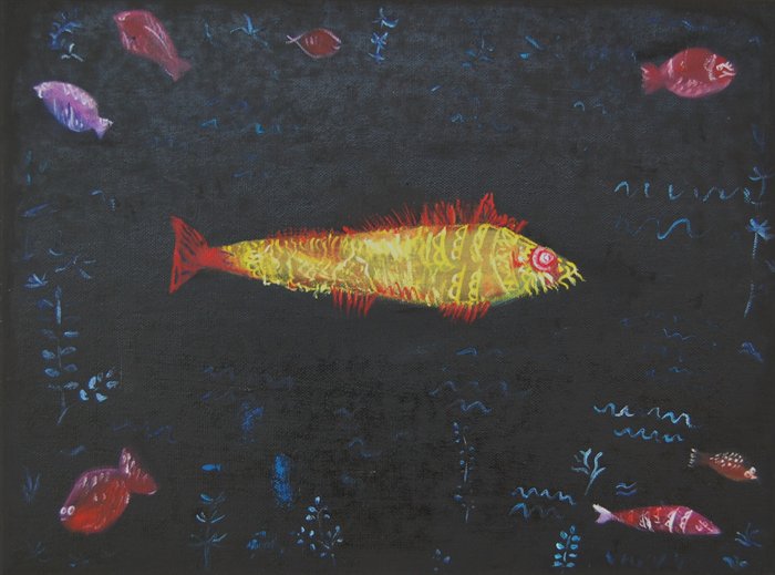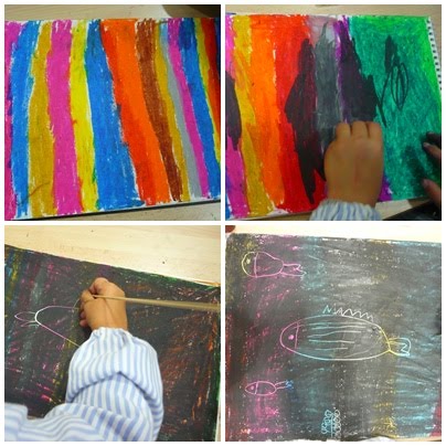 Aquí teniu el quadre de l'artista i els treballs dels nens i nenes fets amb ceres de colors.