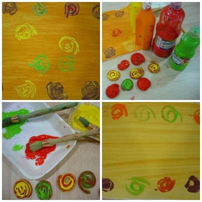 A la classe de plàstica han fet cargols amb plastilina que després han pintat amb colors de tardor per estampar en un paper d'embalar, prèviament pintat amb pintura aigualida.