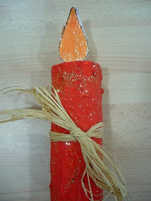 Han fet una senzilla espelma tot cobrint amb aiguaplast un xurro de piscina tallat, després pintat i decorat amb purpurina i finalment una flama que han pintat i punxat també tot sols. I aquest n'és el resultat: