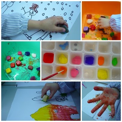 Doncs és tant senzill com omplir una glassonera amb témperes de colors i aigua. Ho barreges tot amb un pinzell i ho fiques al congelador. L'endemà treus els glaçons de colors i a pintar!!!!