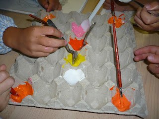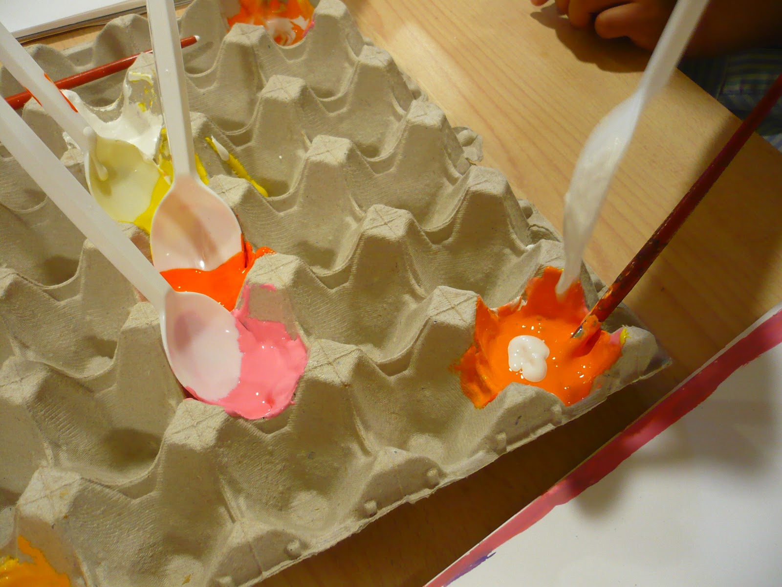 Els nens i nenes de 5 anys s'han iniciat en la barreja de colors, tot buscant el color més semblant al seu to de pell. Per fer-ho em fet servir unes oueres de cartró i unes culleretes de plàstic de manera que cada nen pogués agafar una miqueta de cada color per fer la seva barreja.