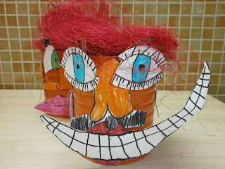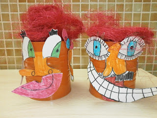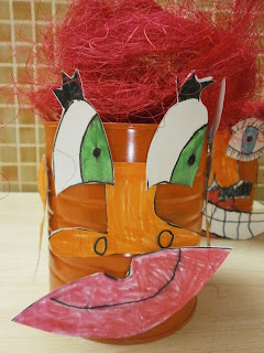 Amb paper, retoladors i tisores els nens i nenes de 5 anys han dissenyat diferents elements per composar una cara (ulls, boques, nasos, orelles, celles, ...) i els han enganxat sobre una llauna reutilitzada.