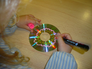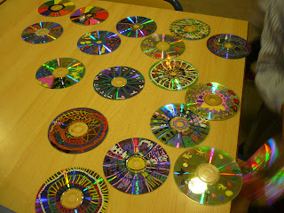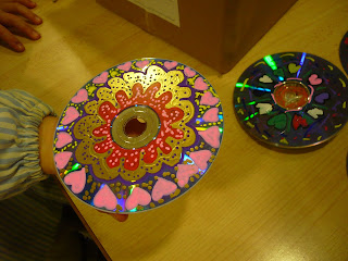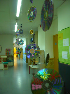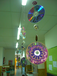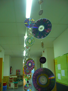 L'Espe del bloc "Plastiquem" em va donar la idea a través d'una de les seves entrades. Els seus alumnes van decorar CD's per fer postals de nadal. Nosaltres els hem decorat per construir mòbils que pengin del passadís, i així acompanyar el projecte dels robots que estan portan a terme els alumnes de 5 anys.