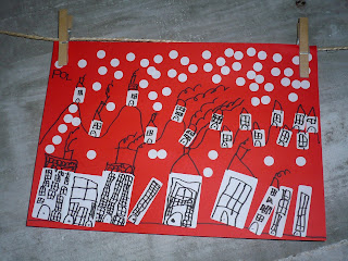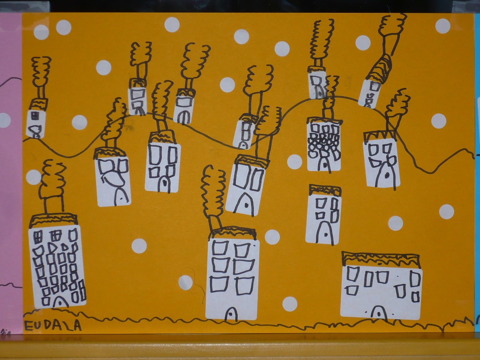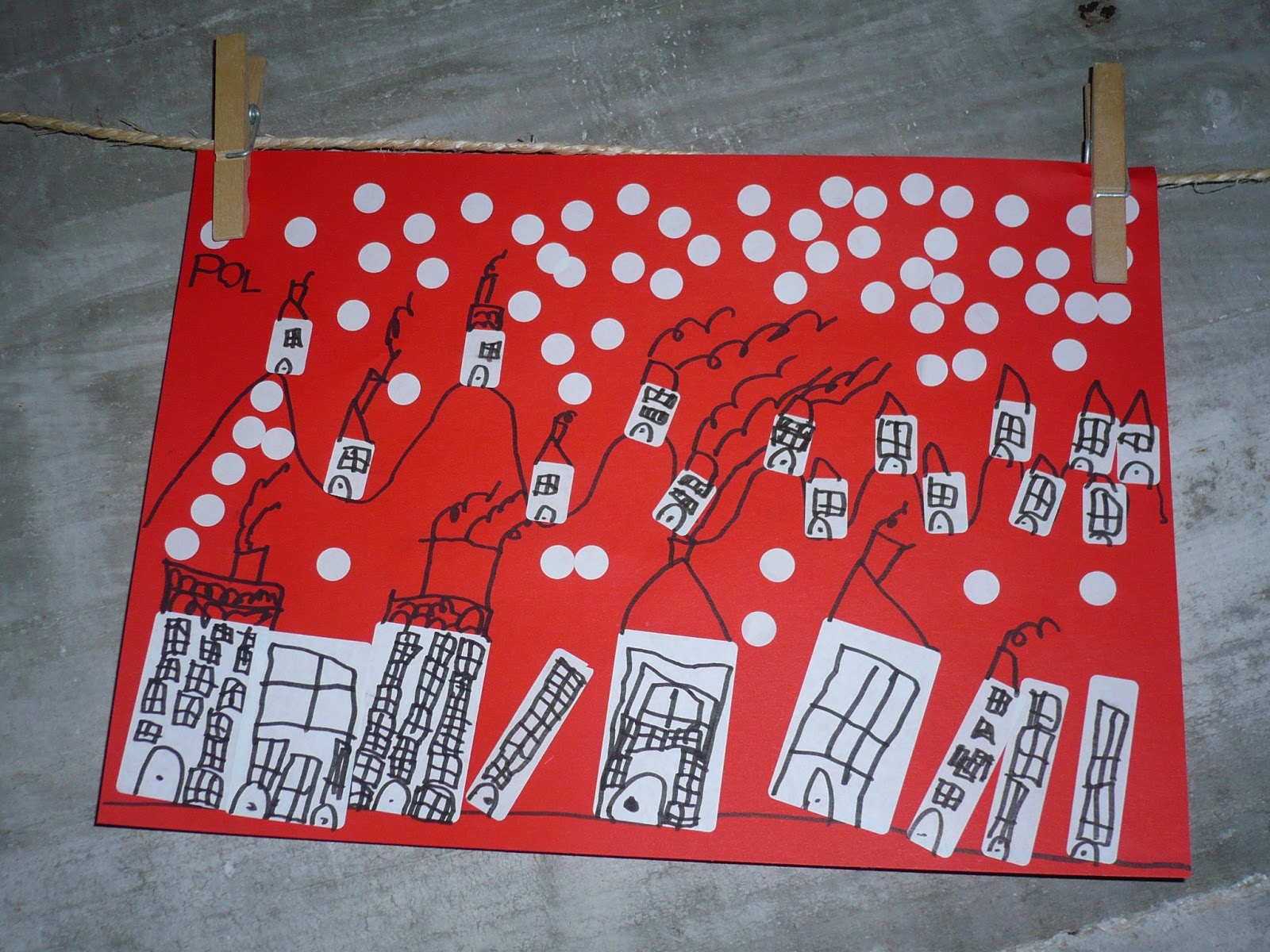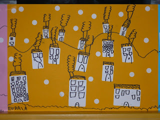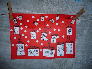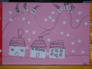 Els alumnes de 5 anys han fet un collage sobre l'hivern fent servir enganxines i papers de colors. Han respectat les proporcions, les enganxines més grans per les cases de més a prop i les enganxines més petites per les cases llunyanes, les de dalt de la muntanya.