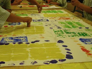 Els nens i nenes de 4 anys estan aprenent dances africanes per ensenyar als pares el dia de la Festa de Final de curs. A classe de plàstica ens hem ambientat en el tema i hem estampat robes tot simulant teixits africans plens de formes i colors.