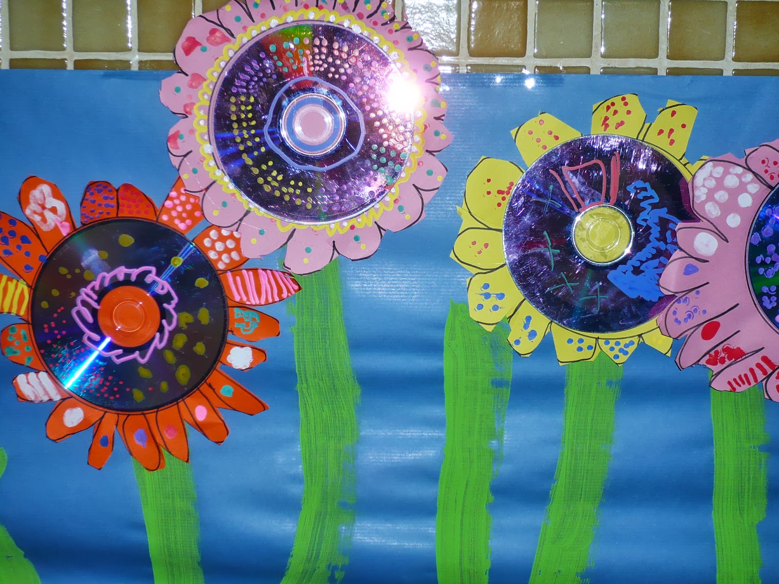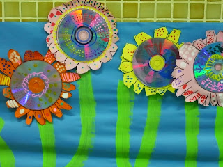 Després de veure les fantàstiques flors del bloc Plastiquem fetes amb CD's, els nens i nenes de 5 anys s'han atrevit a fer-ne unes més senzilletes, però prou resultones!